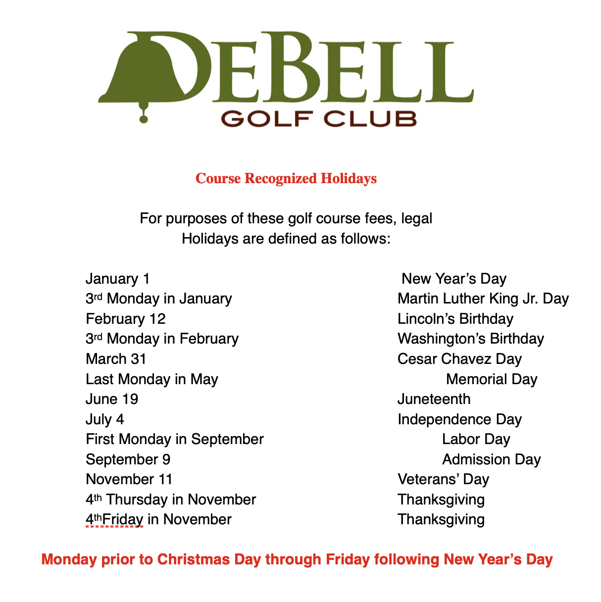 | Rates (include cart) | Monday – Friday | Saturday, Sunday, & Holidays |